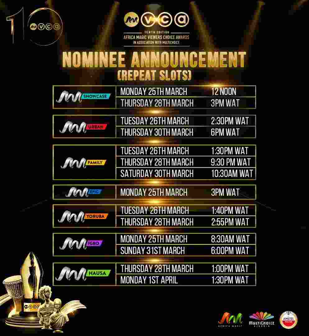 The tenth edition of the Africa Magic Viewers’ Choice Awards is brought to you by Africa Magic in association with MultiChoice, Amstel as the headline sponsor, and tactical sponsors Pepsi, Promasidor, and Martell.