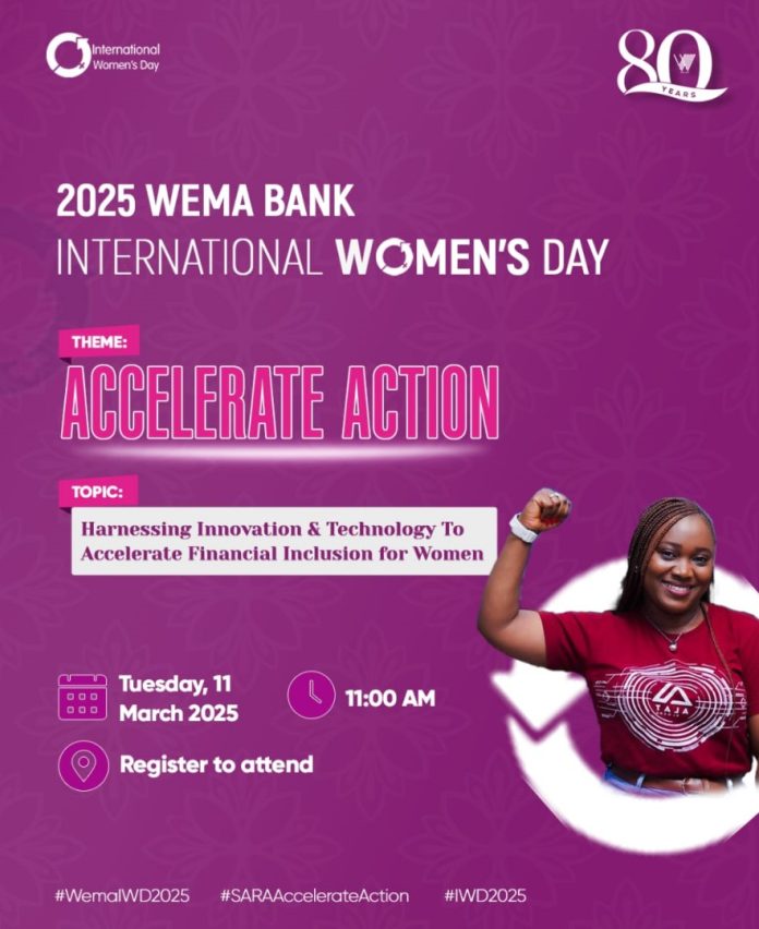 With the global IWD 2025 theme “Accelerate Action”, the Wema Bank IWD 2025 Event will bring together key influential and prominent women from key industries in Nigeria to discuss the topic “Harnessing Innovation & Technology To Accelerate Financial Inclusion for Women,” highlighting the importance of leveraging innovation and technology to sustainably accelerate action towards promoting and enhancing financial inclusion for women.